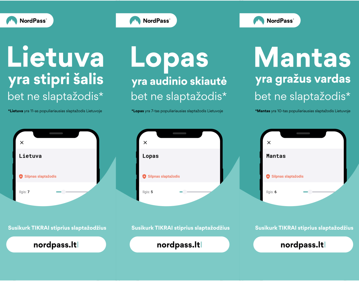 As the rest of the world, a large number of people take online security for granted. Easy-to-crack passwords, reused in various accounts, not using 2FA - this makes life more convenient. But really? Together with the Nordpass team, we selected the most popular passwords used in Lithuania and turned them into a vivid campaign.
